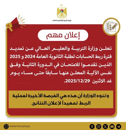 إعلان لطلبة غزة الذين قاموا بالربط بتاريخ 17-18 /11/ 2025 حول آلية الاستعلام عن أرقام الجلوس