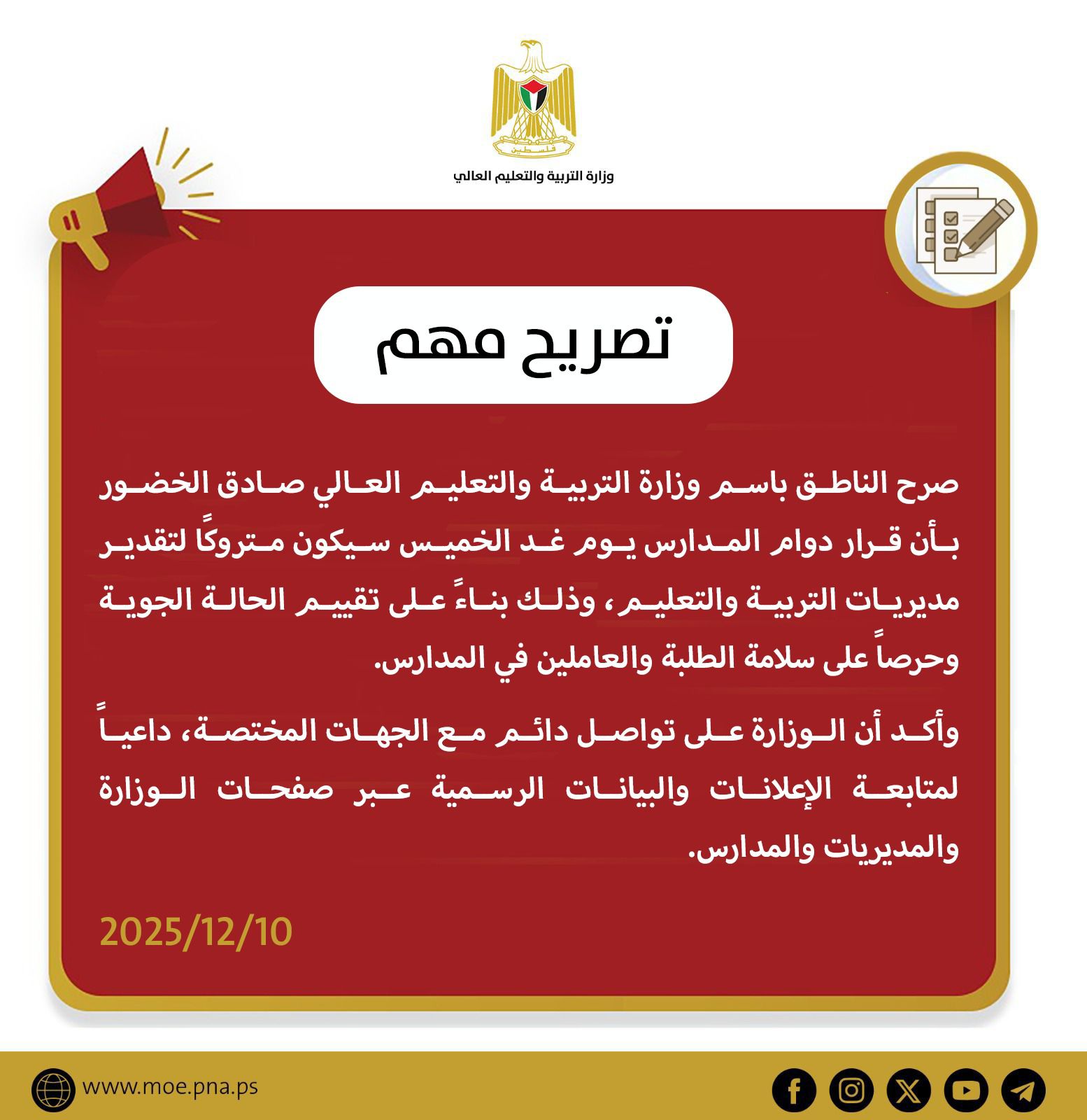 بيان صادر عن وزارة التربية والتعليم العالي بما يتعلق بالدوام المدرسي
