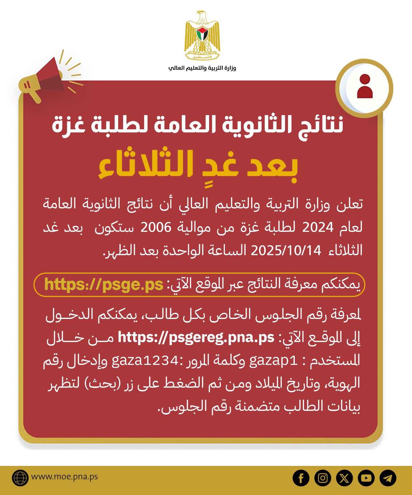 إعلان مهم لطلبة الثانوية العامة في غزة - مواليد 2007